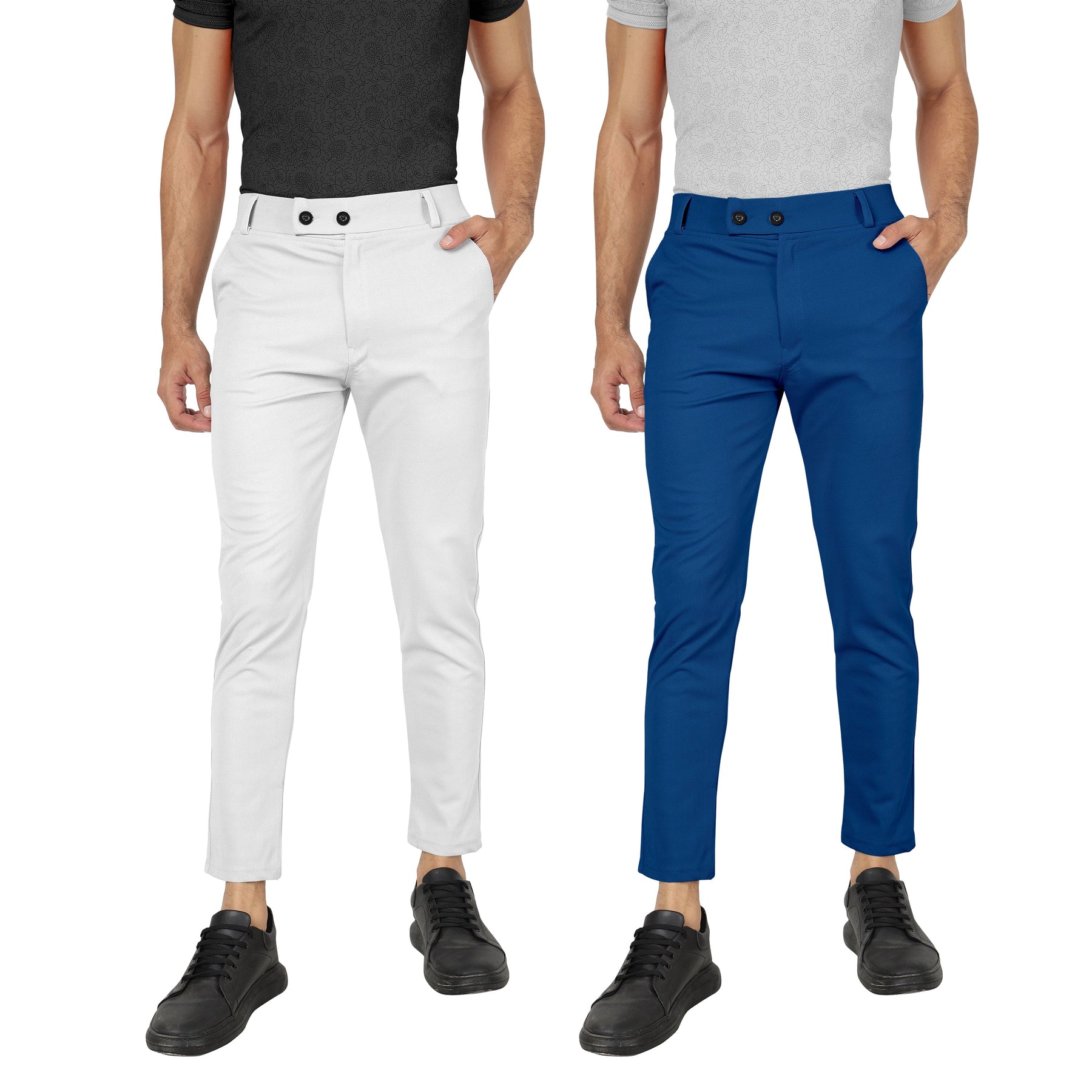 Combo Pack Of 2 White And Teal Blue Lycra Stretchable Formal Stylish Slim Fit Trousers.