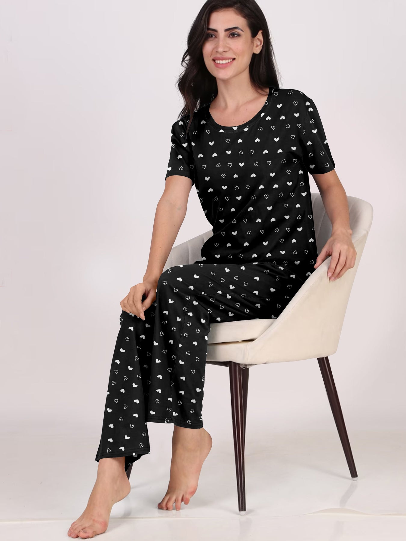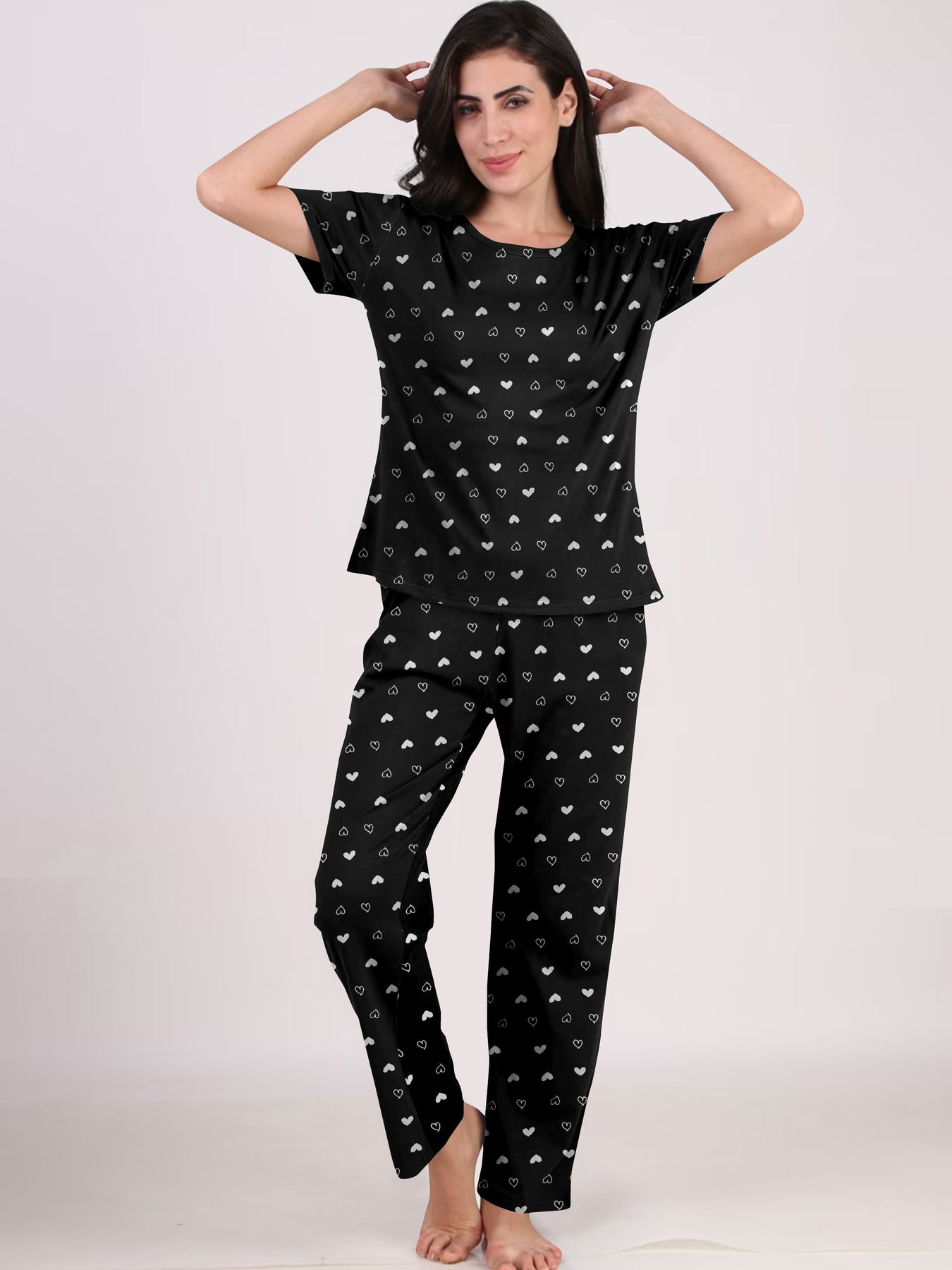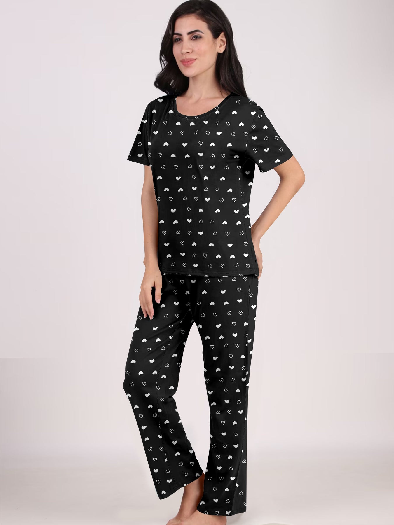 Women's And Girl's Cotton Heart Printed Black Night Suit Set of T-Shirt & Pyjama.