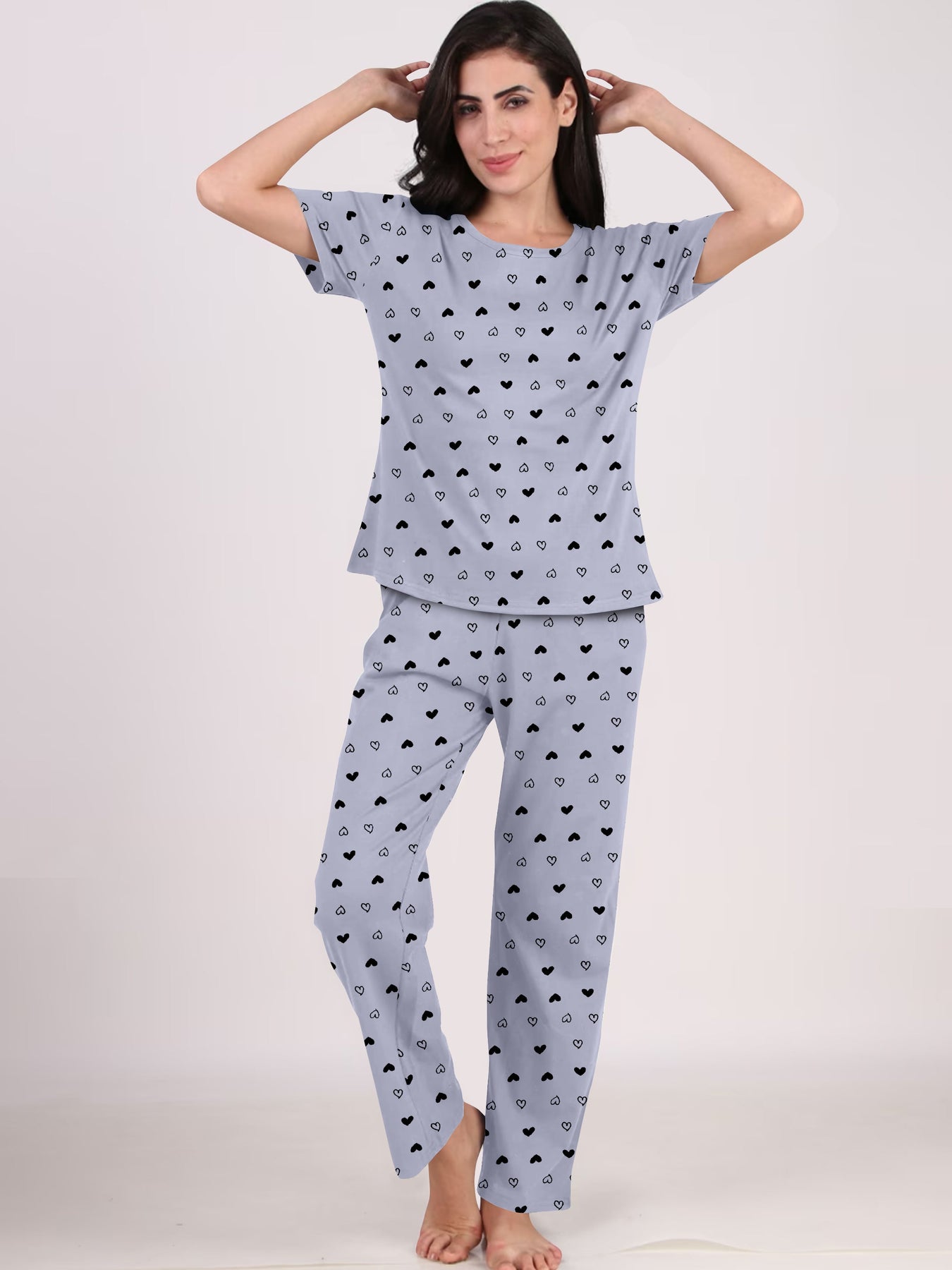 Women's And Girl's Cotton Heart Printed Grey Night Suit Set of T-Shirt & Pyjama.