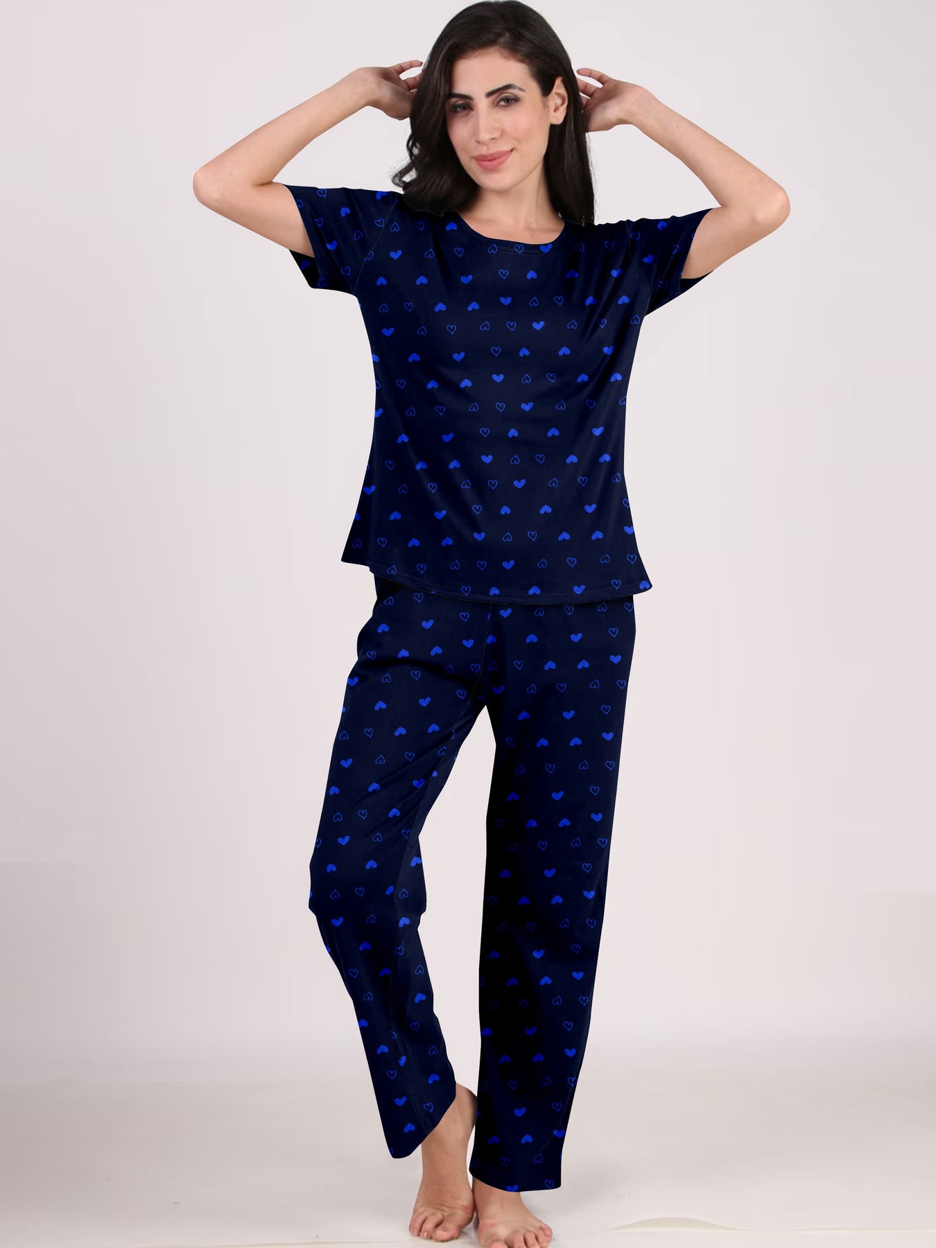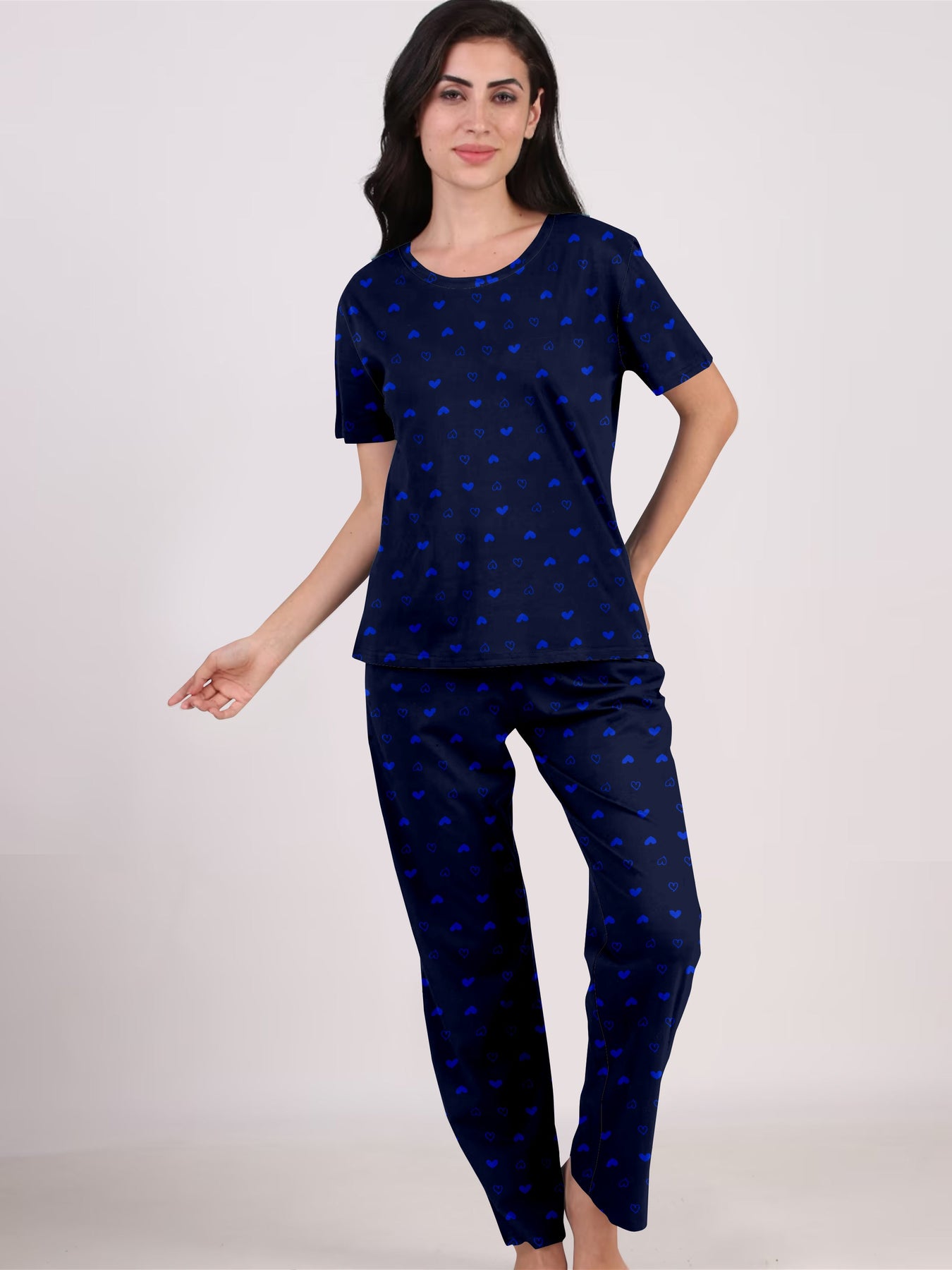 Women's And Girl's Cotton Heart Printed Navy Blue Night Suit Set of T-Shirt & Pyjama.